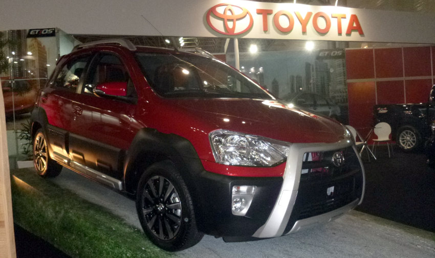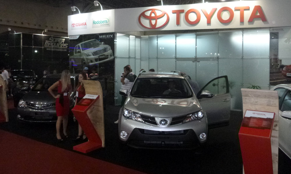 A Toyota deu destaque para o Etios em seu espaço, expondo uma versão hatch, uma sedã e uma Cross – todos linha 2014. Também estão lá um RAV4 e, em segundo plano, um Corolla Altis e uma picape Hilux.