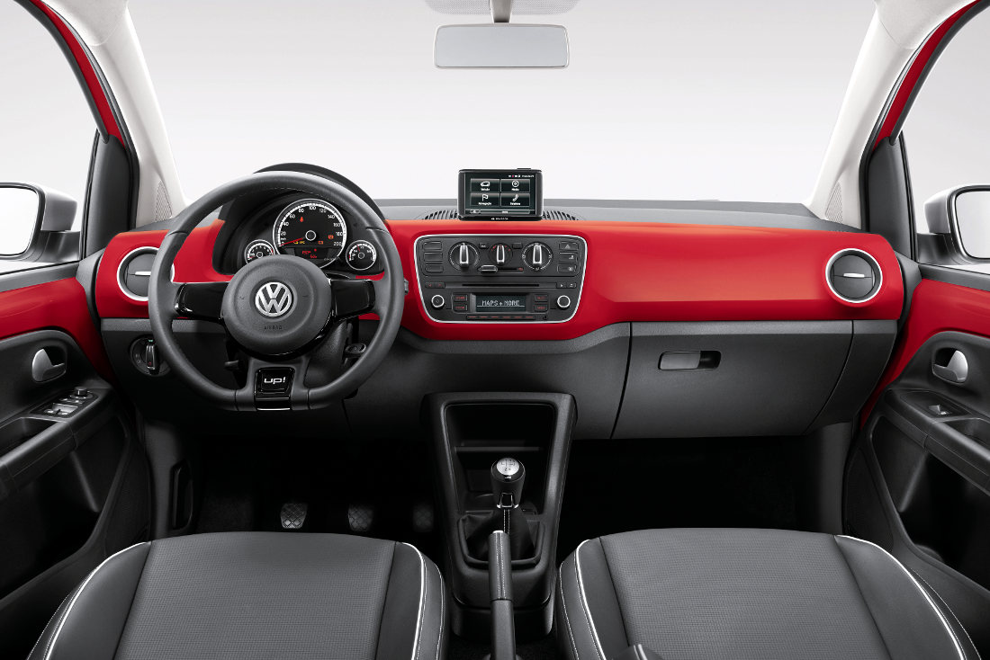 O painel ficou limpo e simples, passando a sensação de que o carro é de mesmo o veículo de entrada da marca. O conta-giros (que, por incrível que pareça, não é de série na versão de entrada) é pequeno. Por outro lado, o volante tem boa empunhadura e a base reta é um charme a mais (além de ser mais esportivo). Os comandos de ar e do som ficam posicionados numa parte mais alta do painel. Um detalhe interessante do up! é que o carro pode ter diferentes acabamentos para o painel (disponíveis a partir da versão move up!) e combinações de ambientação.
