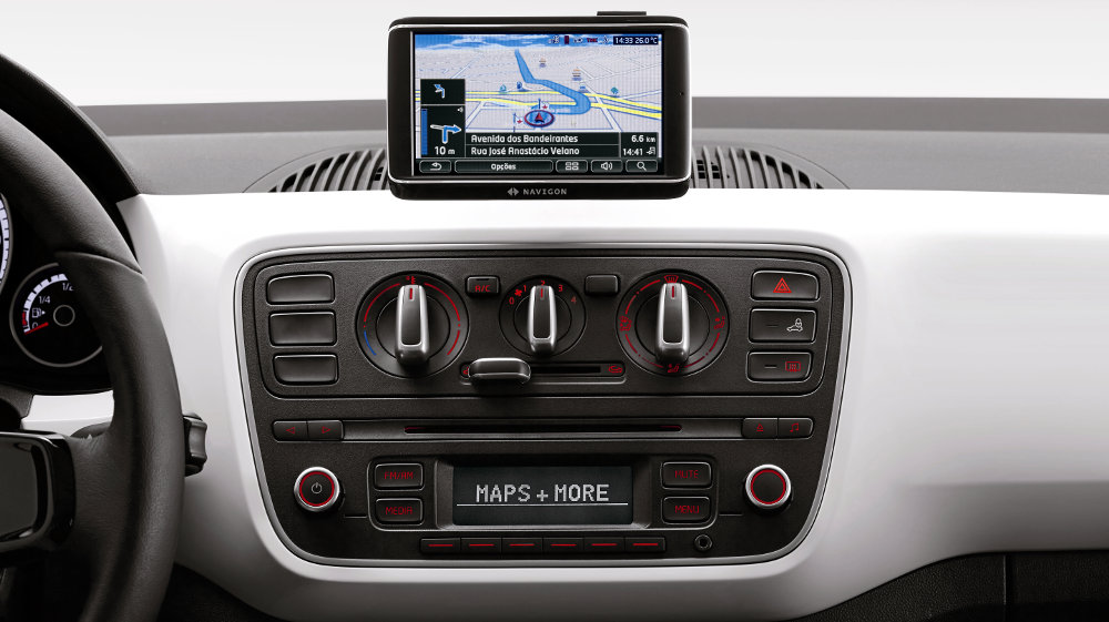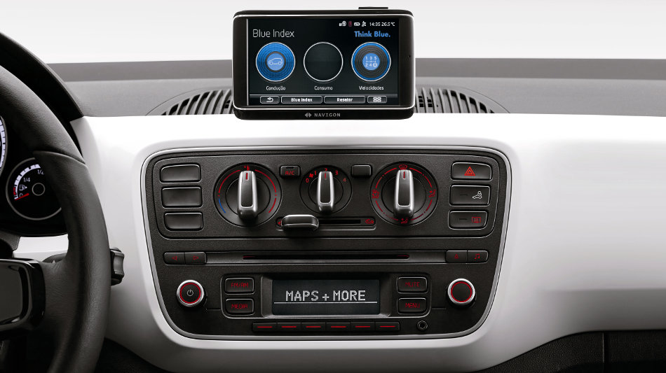 Fechando o interior, o up! oferece como opcional, a partir da versão move up!, o “maps & more”, um sistema que a Volkswagen chama de “infotainment e navegação”. Esse recurso de tecnologia é oferecido pela primeira vez no mercado brasileiro pela Volkswagen. Trata-se de um dispositivo com tela sensível ao toque (touchscreen) que funciona como extensão do rádio e do computador de bordo do veículo, oferecendo também conectividade multimídia e sistema de navegação (GPS), já com mapas brasileiros e com antena interna de GPS, dispensando conexão com aparelhos adicionais. Segundo a marca, “tudo por meio de operação intuitiva e simples de usar”. Pena que tenha ficado tão feio, sem nenhum entrosamento com o painel.