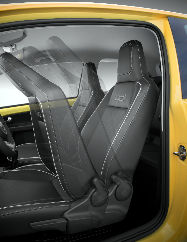 O up! duas portas conta com o sistema de rebatimento dos assentos dianteiros “easy entry”. Tanto no banco do motorista como no do passageiro frontal, há duas hastes de comando para que o encosto recline: uma na direita e outra na esquerda. Ou seja, é possível rebater o banco do lado que for mais cômodo.