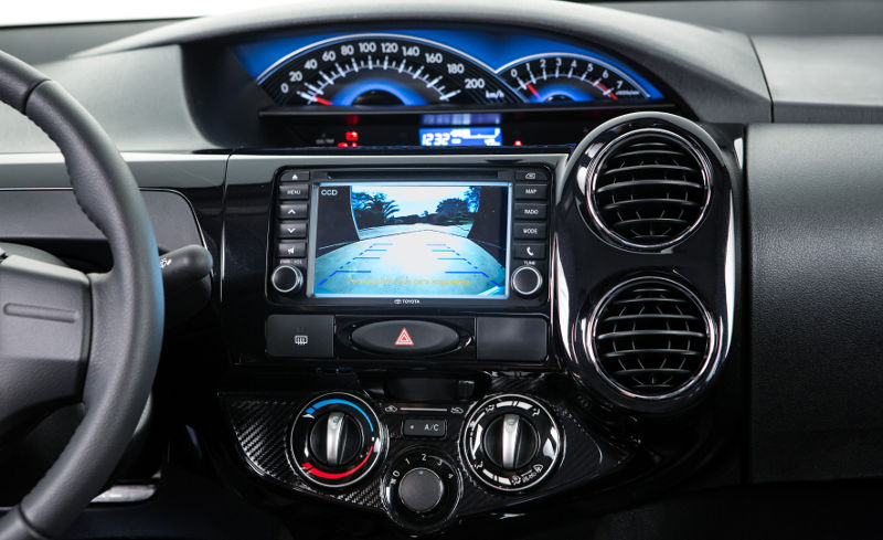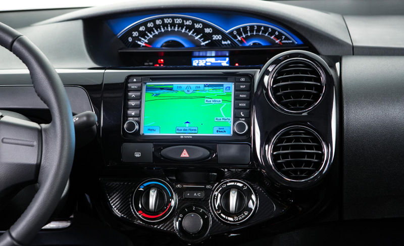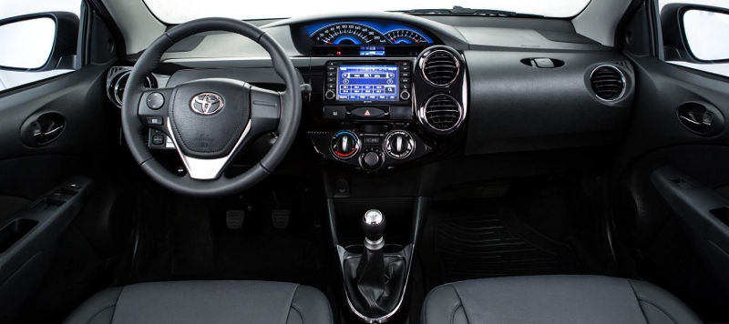 Novo indicador do nível de combustível (melhor do que o antigo), que inclui também relógio digital, volante com o mesmo design do caro Corolla 2015 e do Camry, acabamento em tecido nas portas, maçanetas com detalhes cromados, preparação para instalação de som na traseira, assento do motorista com regulagem de altura, alerta sonoro de portas abertas e faróis acesos e função “auto down” para o vidro elétrico do motorista.