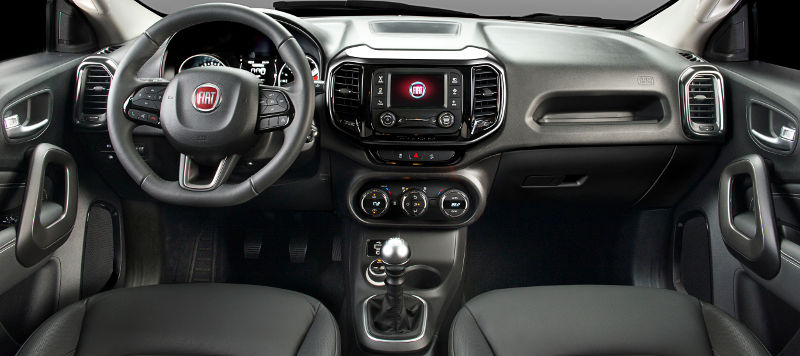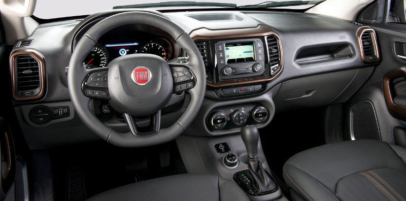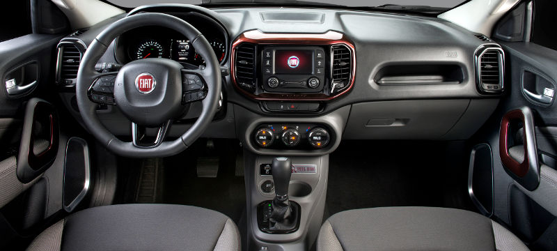 Por dentro, o Fiat Toro tem um painel interessante, que segue a tendência do que vimos no Jeep Renegade e até no Uno. Vale destacar o quadro de instrumentos em TFT 7” colorido, o volante multifuncional revestido em couro, com borboletas para as trocas de marcha; e a Central Multimídia Uconnect Touch NAV 5”.