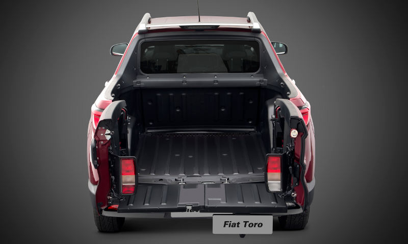 O Fiat Toro inova com a sua tampa da caçamba bipartida, patenteada pela FCA. Ela tem duas portas que se abrem lateralmente, com a possibilidade de abertura de somente uma delas, facilitando o acesso à caçamba, que tem 820 litros de volume podendo ganhar opcionalmente mais 405 litros com um extensor (aumenta o comprimento da picape em cerca de 50 cm). Em quilos, com motor flex são 650 kg de capacidade e, a diesel, são 1.000 kg.
