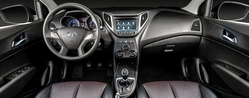 Por dentro, o HB20 Ocean recebeu bancos revestidos em couro preto perfurado com fundo vermelho e costuras na mesma cor e detalhes em cromo acetinado nas saídas do ar-condicionado, botão do freio de mão e maçanetas. As portas dianteiras também receberam acabamento em couro.