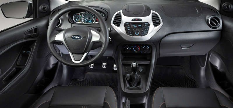 Painel não mudou, mas Ford Ka Trasil 2018 tem bancos em couro sintético e tecido, pedais de alumínio, soleira protetora na porta e tapetes personalizados