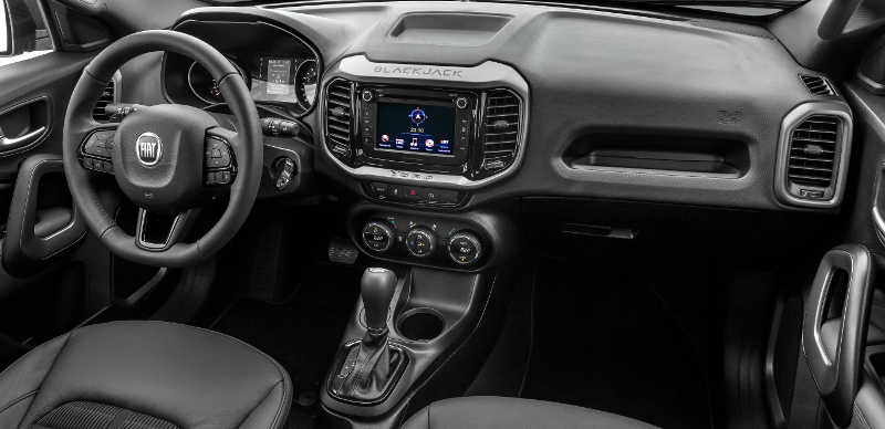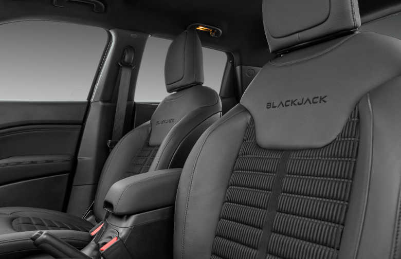 No interior, o ponto alto é o revestimento exclusivo dos bancos, mesclando couro e tecido e com a inscrição Blackjack bordada nos encostos dianteiros. O nome da versão aparece também na moldura da central multimídia, cujo tom cinza claro, que se repete nas molduras das saídas de ar e dos alto-falantes, contrasta com o preto que predomina por toda a cabine.
