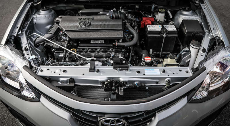 A Toyota usa bloco de alumínio,velas de irídio,virabrequim de titânio,dual vvt-i, tuchos hidráulicos.Injeção sequencial DENSO!Uma bobina por cilindro, coletor de escapamento integrado ao cabeçote, partida com linha de combustível aquecida nas partidas a frio, baixa taxa de compressão em relação aos concorrentes ( menos atraso de ignição por parte da ECU). As peças e o carro em si são desenhadas de uma forma que diminui o atrito,vibrações,ruídos,trepidações,consumo e calor. E aumenta muito a durabilidade.O Calor se dissipa rápido. Não usa correia dentada,usa corrente. O Motor é feito para durar mais de 500 mil quilômetros. O motor ele na verdade,tem 136 cavalos. Mas a Toyota botou um limitador para diminuir as emissões. Os 965 quilos ajudam também.Além do duplo comando na admissão e no escape.É bem estável. E esses 965 quilos + freios bem dimensionados dão a ele o carro que freia em menor espaço do segmento.