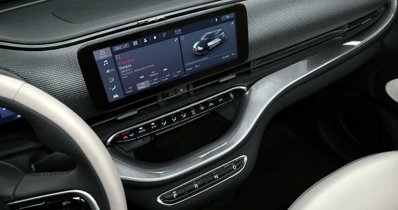 Tela no centro do painel do novo Fiat 500e elétrico conta com o UConnect 5