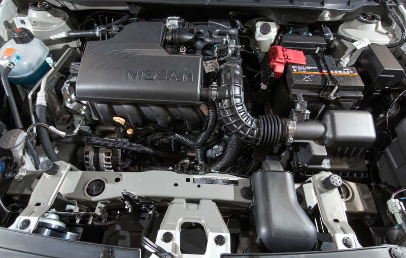 Debaixo do capô, o Kicks tem a segunda geração do motor HR16DE 1.6 16V, de quatro cilindros, que conta com controle de abertura das válvulas continuamente variável (CVVTCS) e sistema Flex Start System (FSS), que eliminou o tanque de partida a frio. Ele desenvolve 114 cv de potência máxima a 5.600 rpm e torque máximo de 15,5 kgfm a 4.000 rpm.