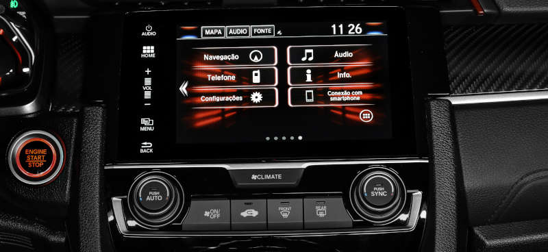 Si tem ainda quadro de instrumentos digital em TFT (como os do Civic EXL e Touring 2020) com iluminação vermelha, pedais esportivos em alumínio e acabamento do painel que imita fibra de carbono.