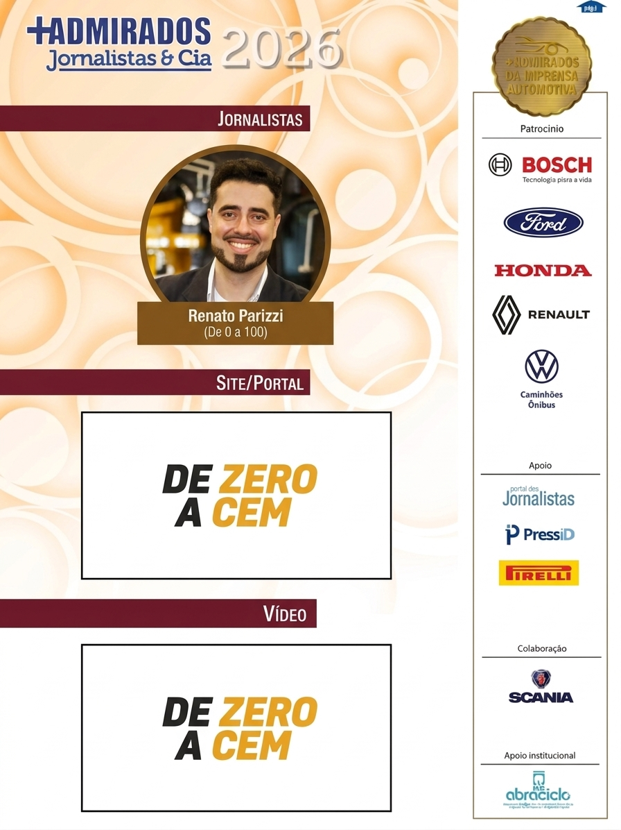 Pela primeira vez, De 0 a 100 e Renato Parizzi (eu!) são finalistas em três categorias da oitava edição do prêmio “+Admirados da Imprensa Automotiva” do Brasil! E você pode ajudar nessa conquista!
